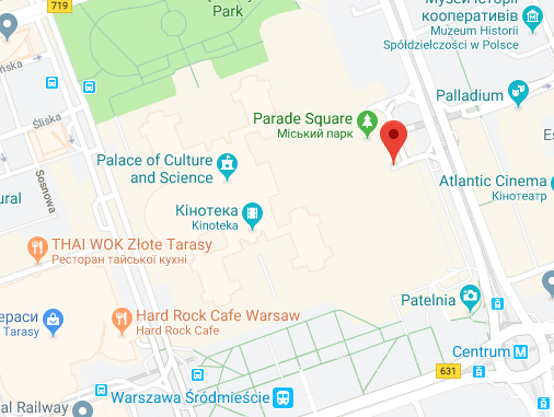 Miejsce spotkania w Warszawie na pl. Defilad. Duży parking przy Pałacu Kultury i Nauki